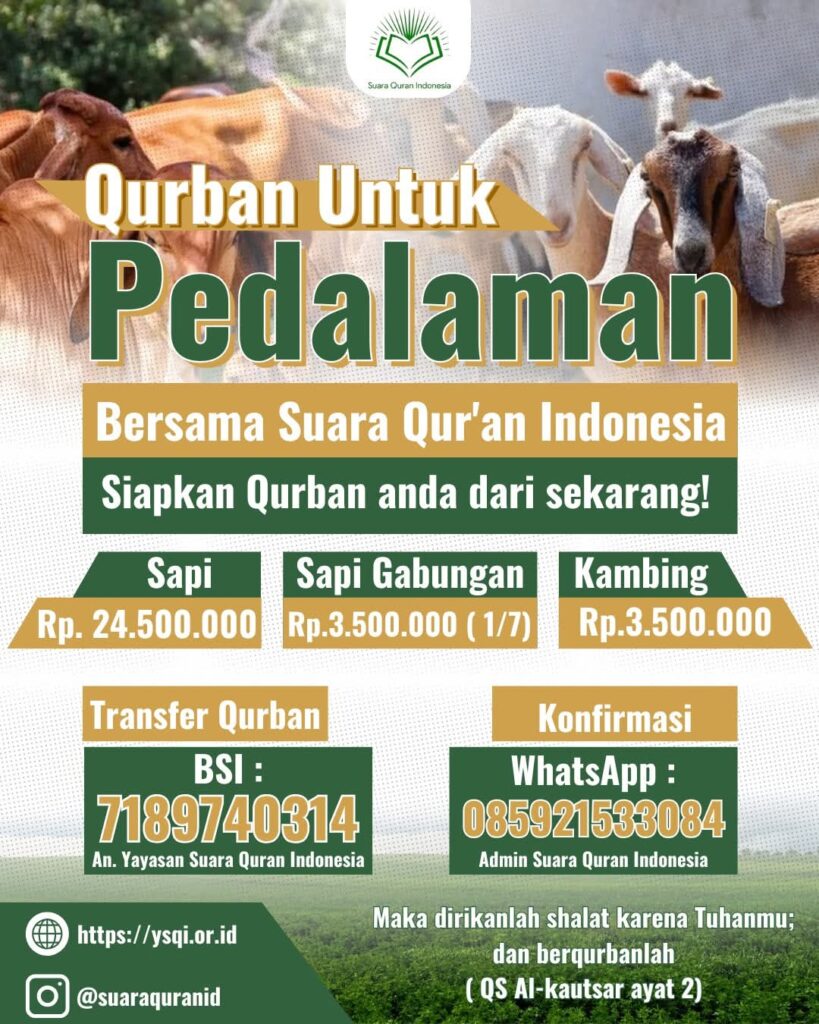 “Dalam rangka menyambut Hari Raya Idul Adha, kami dari Yayasan Suara Qur’an Indonesia mengajak Bapak/Ibu sekalian untuk berpartisipasi dalam program ‘Qurban Untuk Pedalaman’. Ini adalah bagian dari ikhtiar dakwah sosial kami, agar saudara-saudara kita di pelosok nusantara dapat merasakan kebahagiaan yang sama di hari raya,” ujar Ust. Syafparudin.